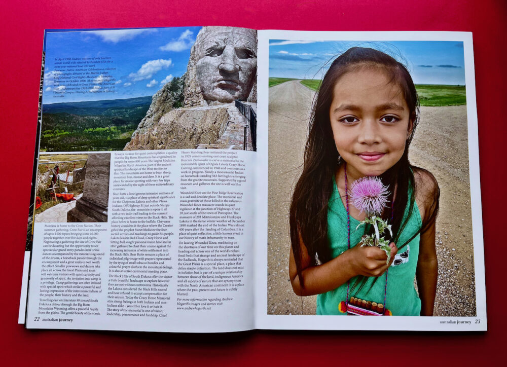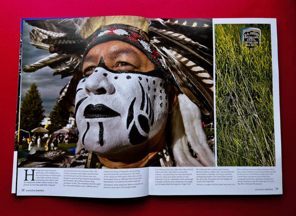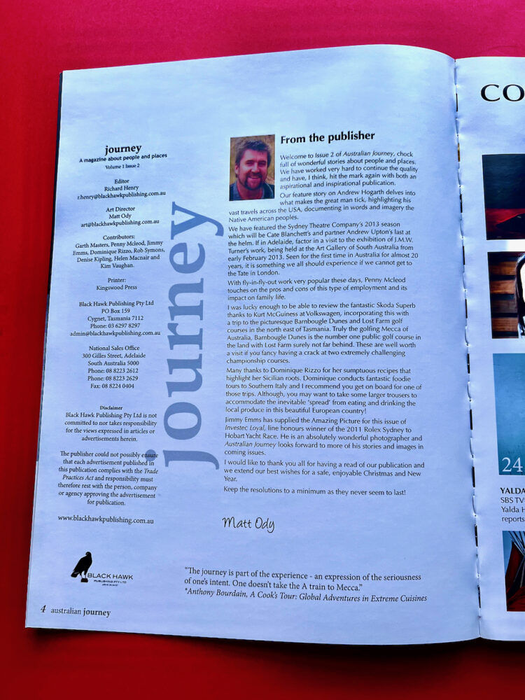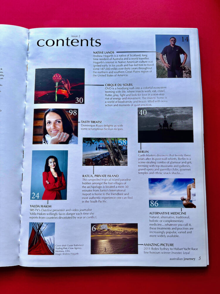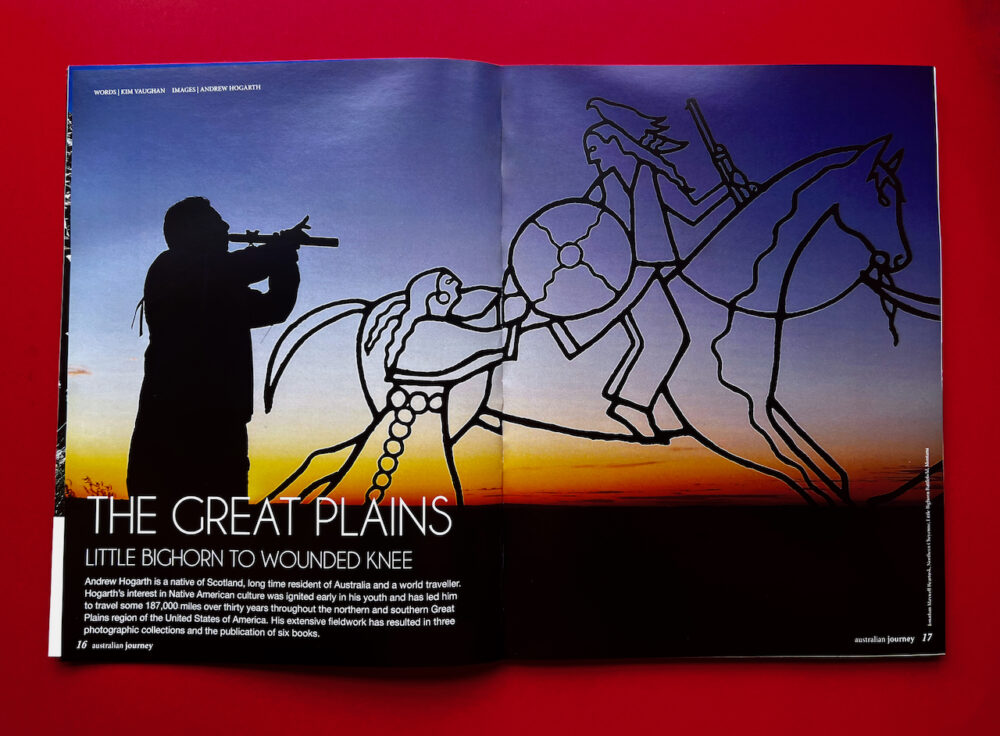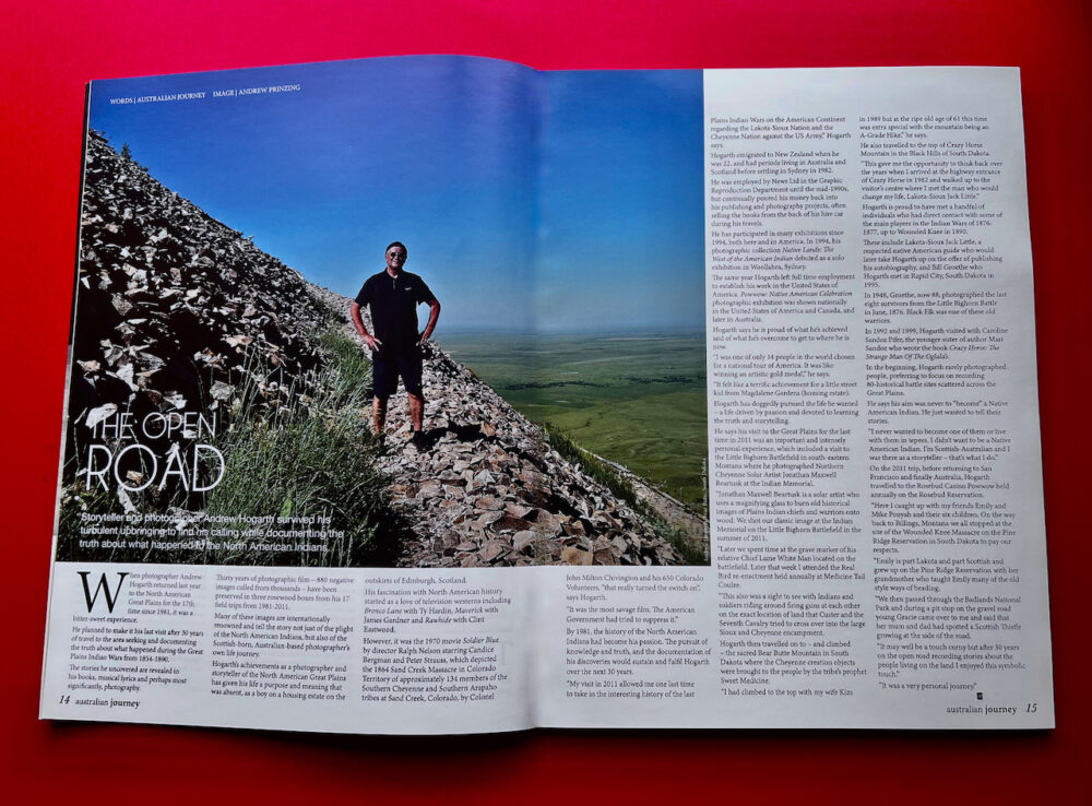 It is always a wonderful experience when money does not cloud the artistic creative process. Over the last few months of 2012 while dealing with my serious illness I collaborated with long time friend Matt Ody from my News Limited days on a ten page article and front cover image that dealt with aspects of my thirty years of travelling 187,000 miles across the Great Plains of the United States of America and in particular the Great Plains road trip of 2011. It was indeed a honour to have my story presented in such a beautiful high end coffee table magazine. Academy Award winner Cate Blanchett and her Sydney Theatre Company only had four page and the world renowned circus “cirque du soleil” had only eight pages. The Canadian based company had paid the Tasmanian publisher for a two page colour advert spread and in the business one normally gets the front cover as a bonus free of charge. The magazine arrived from the printers late last week and is now available nationwide across Australia at local newsagents. Another winning line crossed for Andrew Hogarth Publishing!