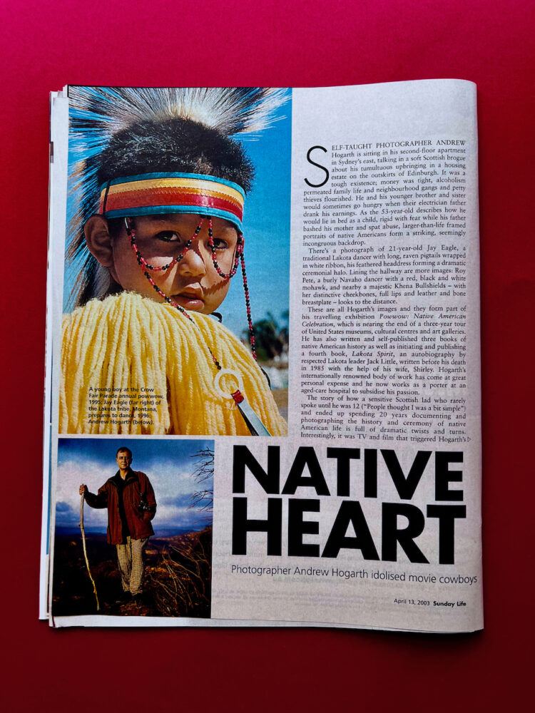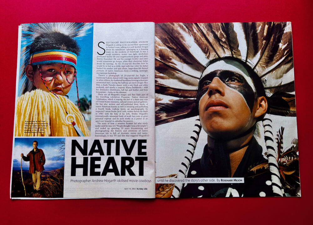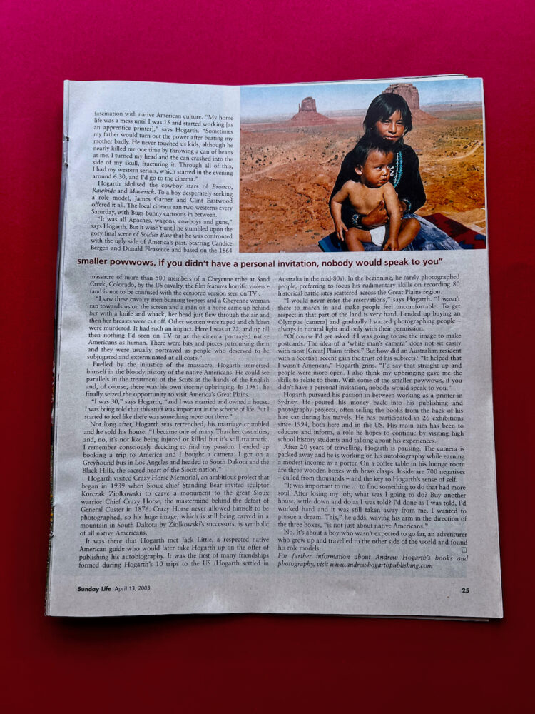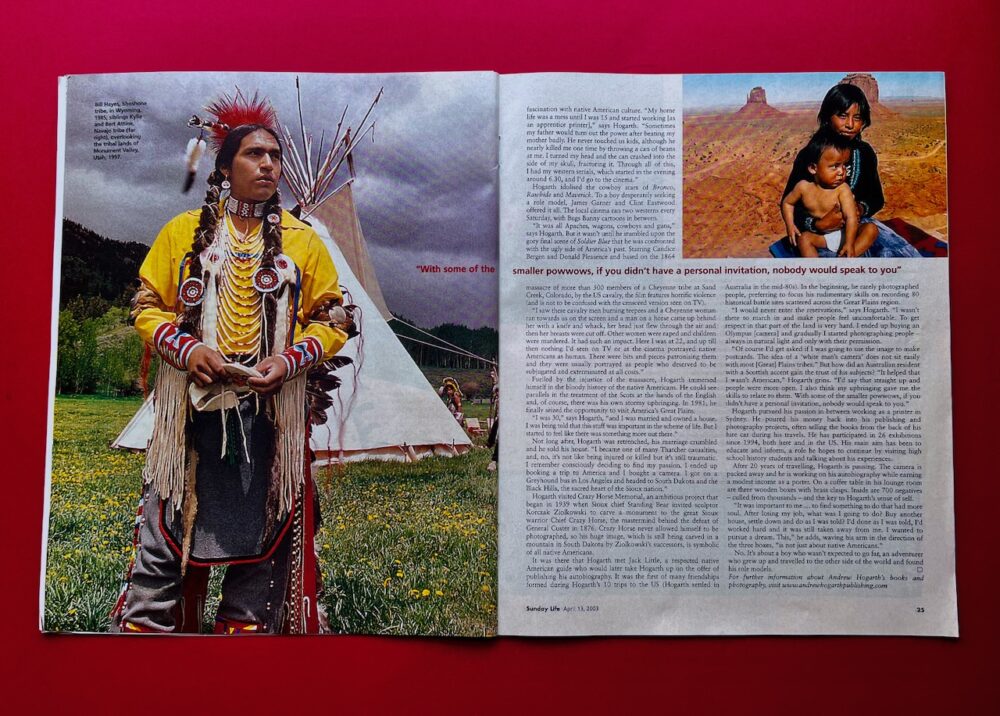 The Sun Herald Sunday Life Magazine 13th of April, 2003: The good old days of hardcopy publishing! There was a four page article and colour spread by journalist Rosemarie Milson in the Sun Herald Sunday Life Magazine with 700,000 hard copies distributed in New South Wales and Victoria in mid April, 2003. My first website had a staggering 241,000 thousand hits on the Sunday alone followed by 71,000 thousand hits on the Monday. The Sunday edition of the magazine also saw 25,000 text and image driven pages printed out of the Andrew Hogarth Publishing website. Once again this was gigantic numbers in 2003 and it showed a real strong interest in my journey documenting Native American culture and history. I fondly remember sitting with my wife Kim Vaughan and co-author of two books relating the the Great Plains Indian Wars 1854-1890 at a Double Bay cafe in Sydney, Australia enjoying breakfast and looking through the Sun Herald Sunday Life Magazine that morning. During that recent era of the internet and cyberspace that dominated the warp speed traction world of computers with its light bulb visuals hard copy publishing was still king of the information cycle. The team of journalists that worked at the Sunday Life Magazine were the cream of the cream and their in-depth interviews with high rollers in the world of politics and entertainment was always well thought out and interesting to say the least. This was one of the main reasons that their readership numbers in New South Wales and Victoria were solid to the core. Before and after my published interview with Rosemarie the magazine highlighted articles by Hilary Clinton, The Dixie Chicks, Harry Kewell, Michael Douglas, Helena Christensen, David Gulpilil, Nigella Lawson, Arnold Schwarzenegger, Sharon Stone and many more cool dudes to boot! The magazines budget was healthy and prior to the publishing of my story I was driven by Sage one of the magazines stock photographers from Bondi Junction to Blackheath in the Blue Mountains to have my photograph taken for the impending story. It was a fun day out having some lunch at a Blackheath cafe and then trampling across the mountain and gorge areas of the Blue Mountains with my newly acquired tree branch walking stick. Fond memories indeed of spreading the word about my adventures driving 200,000 miles across the Interstates and Highways of the United States of America from 1981-2013.
