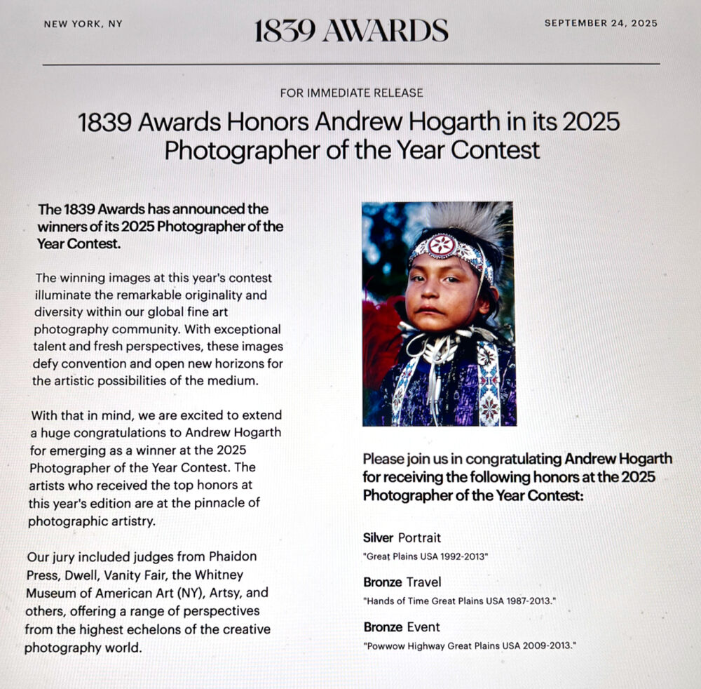 Extremely pleased and proud to have won the Portrait Silver and two Bronze Awards at the 1839 Awards for Non Professional Photographer of the Year Contest 2025 for my image of Cheyenne Quanah Kaline 1992 and Zuni Kai Lamar for Travel also 1992 plus my Cody Wyoming Powwow Bustle 2011 for Event. Nice way to bookend a life well lived now into my seventy-fourth year of trampling Mother Earth! As a working artist/storyteller for over four decades publishing my own creative works as a sole trader under the banner of Andrew Hogarth Publishing, it still amazes and inspire me when I see images brought back to life with a new collaboration and current project. This time around was with the highly respected 1839 Awards Photographer of the Year Contest in the USA. The image in question was of Quanah Kaline the young Cheyenne powwow dancer that was created quickly in fading natural light when I visited the Cheyenne/Arapaho Colony Powwow in western Oklahoma in 1992. Quanah’s image had graced the cover of my 1994 book Native Lands: The West of the American Indian 1982-1992.